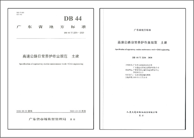 2020年9月,由广东省交通集团有限公司、广东能达公路养护股份有限公司主要参与编制的广东省地方标准《高速公路日常养护作业规范 土建》,经广东省市场监督管理局正式批准发布。它的发布,既较好的满足了省内高速公路养护作业地方特点的要求,增强了养护工作的可操作性,还对广东省高速公路养护作业的日常养护内容、资源配置、作业要求,规范养护作业的行为与质量标准提出了更高的要求,确保了广东省高速公路养护作业的规范、优质、快速和安全。
