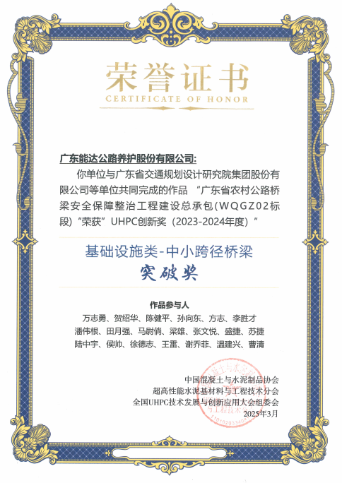 2025年3月13-15日,由中国混凝土与水泥制品协会超高性能水泥基材料与工程技术(UHPC)分会举办的第二届全国UHPC技术发展和创新应用大会在武汉顺利召开。由公司参与完成的项目“广东省2021年农村公路桥梁安全保障整治工程建设总承包(WOGZ02标段)”获得UHPC创新奖(2023-2024年度)基础设施类-中小跨径桥梁突破奖。