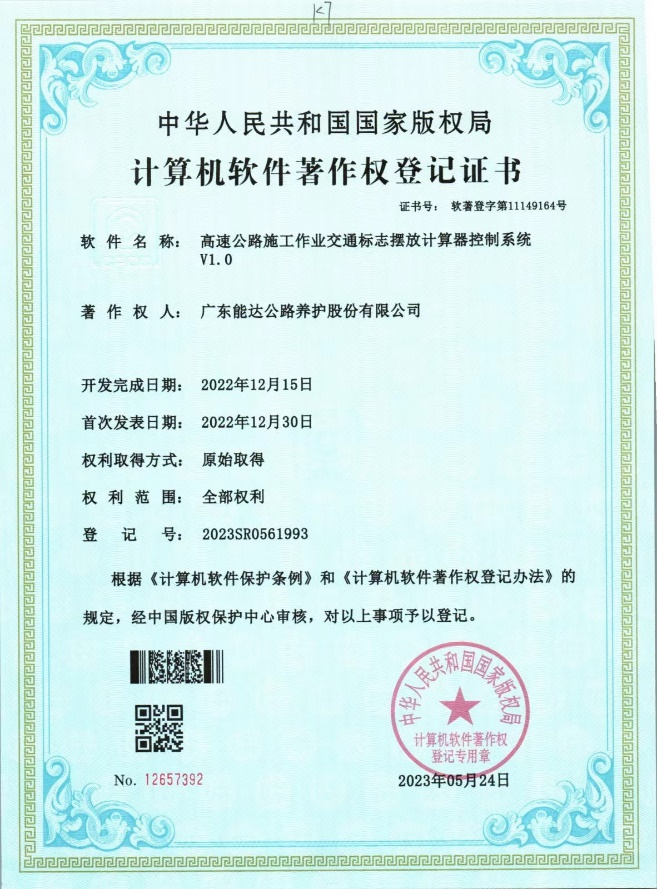 2023年5月24日,公司申报的高速公路施工作业交通标志摆放计算器控制系统获得了计算机软件著作权登记证书。