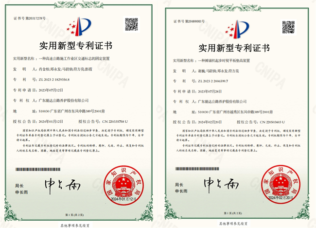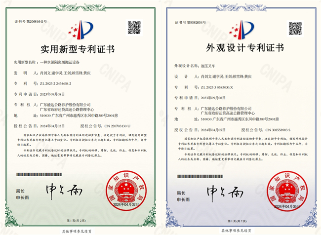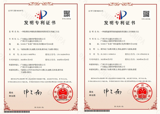 2024年,公司新获得2项发明专利和4项实用新型专利。发明专利是一种防滑抗冲刷的沥青路面精固封层及其施工方法,专利号:ZL202311039693.0和一种铺筑超薄罩面的超韧沥青混凝土及其制备方法,专利号:ZL202310055778.1;4项实用新型专利分别是一种高速公路施工作业区交通标志的固定装置,专利号:ZL2023218293548 ;一种摊铺机起步时熨平板垫高装置,专利号:ZL202322006599.7;一种水泥隔离墩搬运设备,专利号:ZL 2023 2 2434654.2和液压叉车,专利号:ZL202330583030.X。
